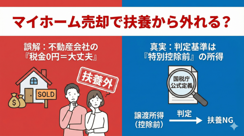 これらの理解は、税法上は明確に誤りです。 国税庁の公式見解では、扶養に入るための判定基準となる「合計所得金額」は、3000万円の特別控除を適用する「前」の金額を使用する と明確に定められています。言い換えれば、特別控除を使って実際の税金がゼロになったとしても、控除前の売却益が一定額を超えていれば、税制上の扶養からは外れるということです。