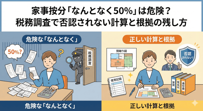 したがって、家事按分は「一律○%」ではなく、自身の業務実態に即した合理的な算定と、その根拠の記録が不可欠です。