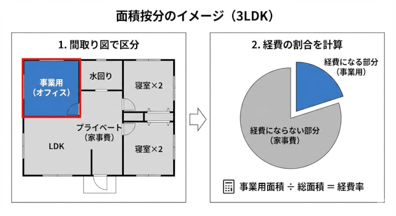 したがって、最も合理的で、税務署に反論の余地を与えない方法は、「床面積による按分(面積按分)」がベストとなります。※合理的に説明できるのであれば時間按分でも問題ない可能性はあります。