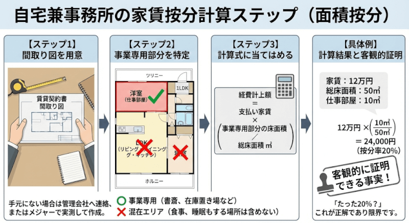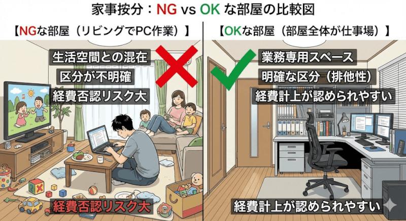 - 事業用スペースは「生活空間」と混ざっていないか?(リビング兼用は計算から除外する勇気を持つ)